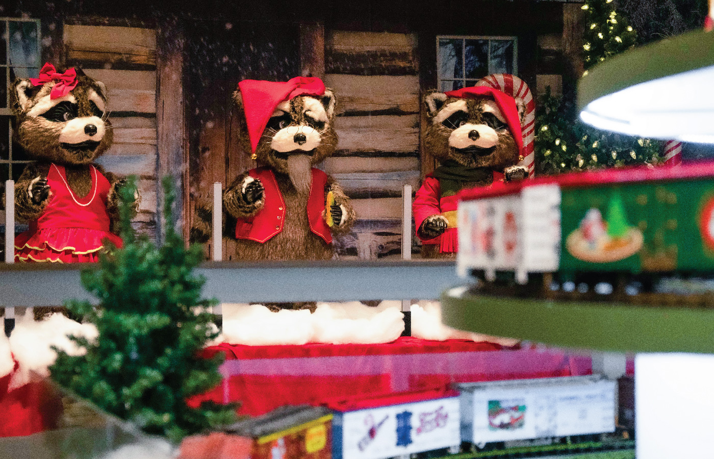 - Christmas Village is a building at the end of the trail that guests can come inside and visit. Christmas Village is the perfect place to enjoy a hot cup of cocoa or an evening treat while surrounded by a cuddly cast of creatures and our working model train display. Guests will be entertained by our adorable Raccoon Band that dances and sings to Christmas music, Department 56 village collection and the Country Christmas Post Office where kids can write a letter to Santa. Don’t miss all of the new items available for purchase in the Christmas Village Market including concessions, 3D Holiday Glasses, Lazy Ones PJs, Outerwear, and more.